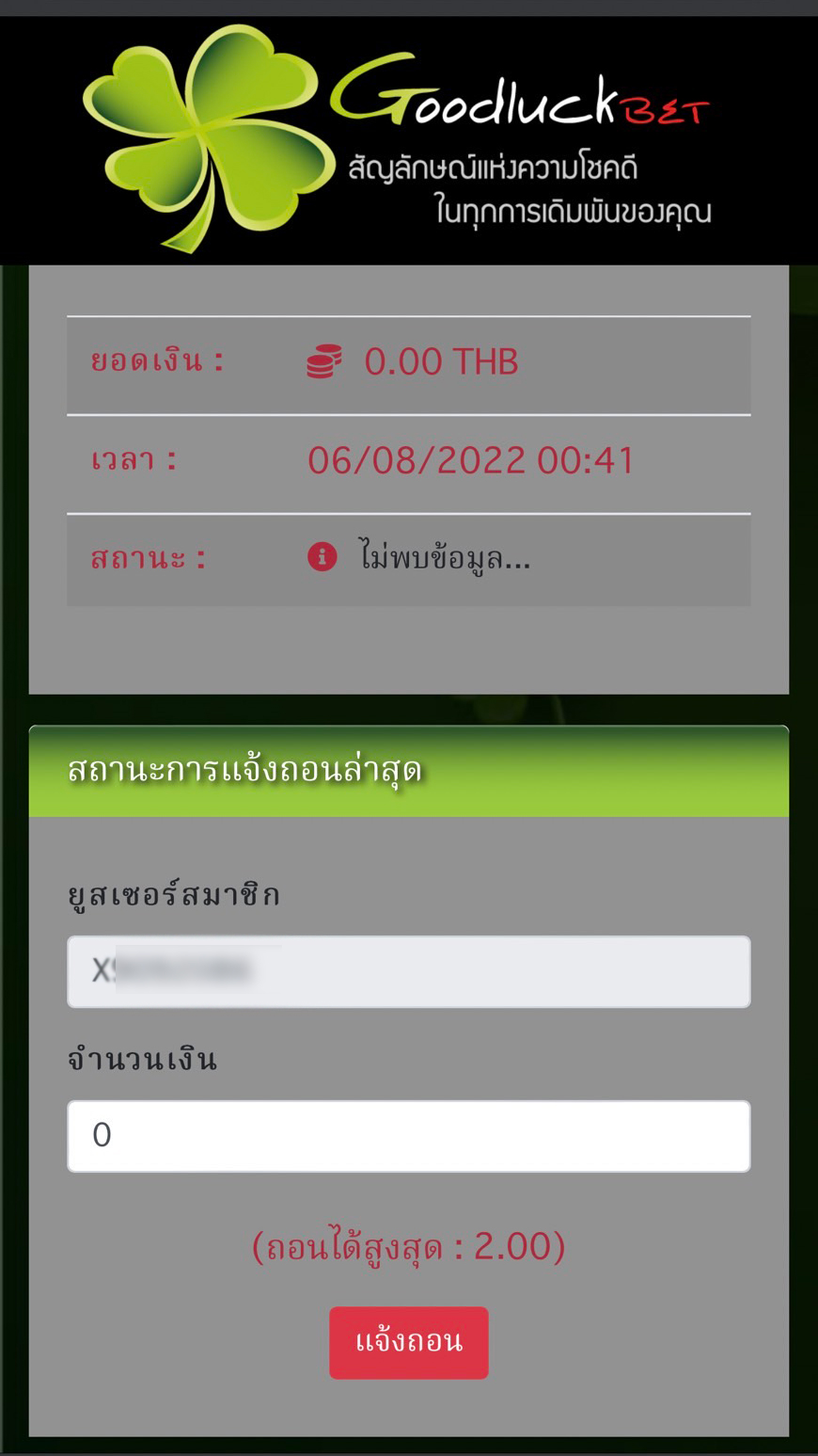 กรอกจำนวนเงินแล้วกดที่ปุ่ม "แจ้งถอน"